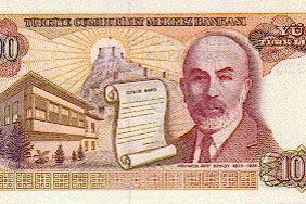 100 TL'de (1979-1989) Ankara Kalesi, Mehmet Âkif Ersoy'un portresi, müze haline getirilen Ankara'daki evi ve İstiklâl Marşının ilk iki dörtlüğü